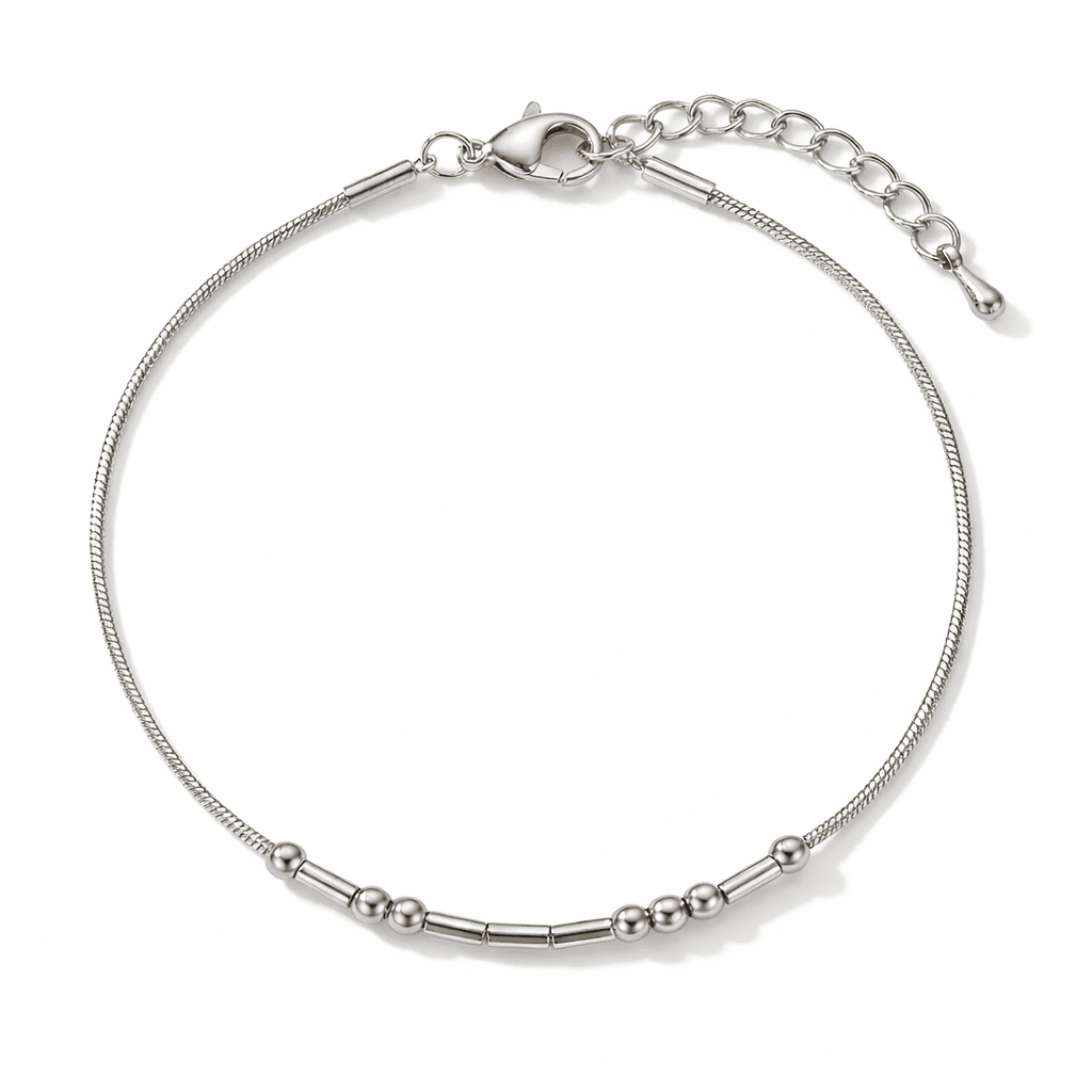 Morsecode in zilverkleurig kralen en staafjes